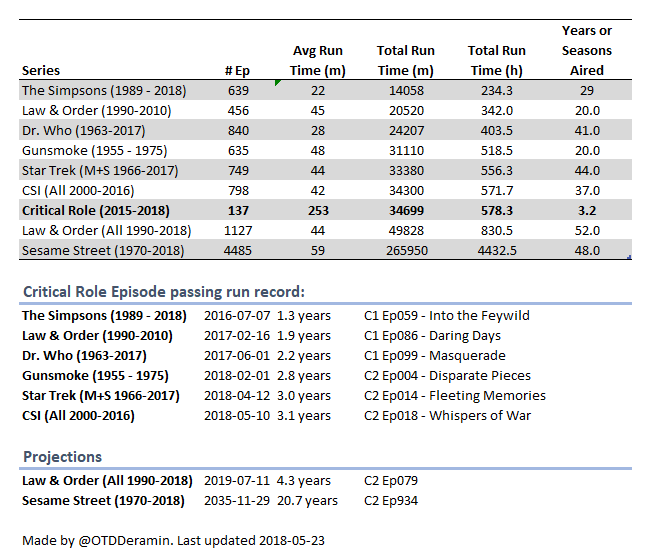 Critical Role is longer than The Simpsons, the original Law & Order series, all Dr. Who series combined, Gunsmoke, all Star Trek series and films combined, & all CSI series combined. It’ll pass all Law & Order series combined in 1.13 years. It is gaining on Sesame Street (though it’ll probably never pass it, but who knows, #Goals).