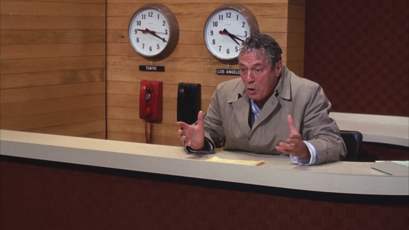 Standing up, “So, I want you to get up now. I want all of you to get up out of your chairs. I want you to get up right now and go to the window, open it, and stick your head out, and yell, ‘I’m as mad as hell, and I’m not gonna take this anymore!” Walking around the desk and out of the set towards the camera, “I want you to get up right now. Get up, go to your windows, open them, and stick your head out, and yell, ‘I’m as mad as hell, and I’m not gonna take this anymore!’ Things have got to change! But first, you’ve gotta get mad! You’ve gotta say, ‘I’m as mad as hell, and I’m not gonna take this anymore!’ Then we’ll figure out what to do about the depression and the inflation and the oil crisis! But first get up out of your chairs, open the window, stick your head out and yell and say, ‘I’m as mad as hell, and I’m not gonna take this anymore!'”